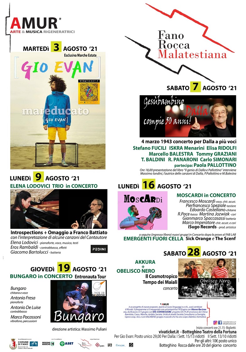 Otto intense serate che rappresentano anche ulteriori occasioni di lavoro per le maestranze, i tecnici, gli operatori del settore, in gran parte molto giovani, che vanno ad integrarsi con il fitto calendario di eventi che la Rocca di Fano ospiterà nel corso dell’estate: Centrale Fotografia (mostra-evento); San Costanzo Show (spettacoli comici); Kaleidoscope (Mostra di Sara Forte); Symphony Pop Festival (concerti su autori pop-rock dell’Orchestra Sinfonica Rossini); Comizi d’amore nell’anno di Dante - FanoXDante (incontri e performance artistiche con personalità del mondo culturale, musicisti, attori); Impronte Femminili (mostra di Mara Cerri); Cinefortunae “Capolavori restaurati by the sea” (incontri e rassegna cinematografica); Concerti d’organo, dell’orchestra fiati, del Gospel Choir e della banda città di Fano; Lido la Fortuna (mostra di giovani artisti in residenza); Concerto di Emiliano Toso; Il Paese dei Balocchi (mostra sulla storia della manifestazione); Baffi dallo spazio (Musiche, avanguardie e altro); Vitruvio e Fano (conferenza- presentazione pubblicazione); Artisti per Dante – FanoXDante (Mostra di opere di 65 artisti dedicata a Dante con il patrocinio dell’Accademia di Brera); No More Wounds/Mai più ferite (Mostra promossa da RWLSEE).